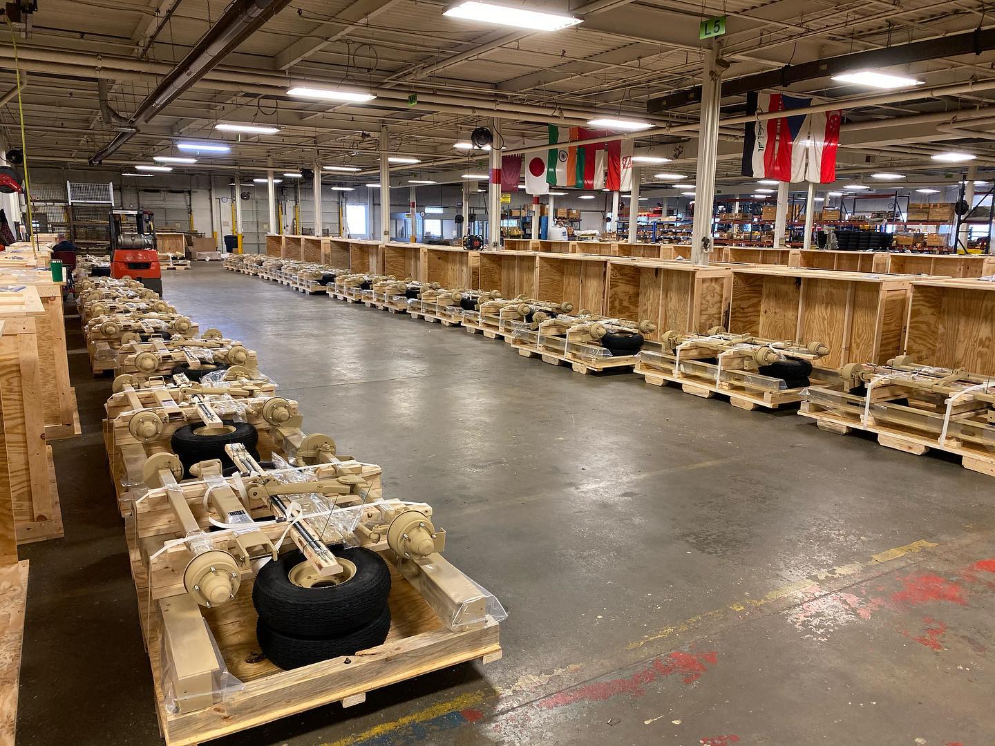 Rows of running gear wheel kits waiting to be packed for distribution.