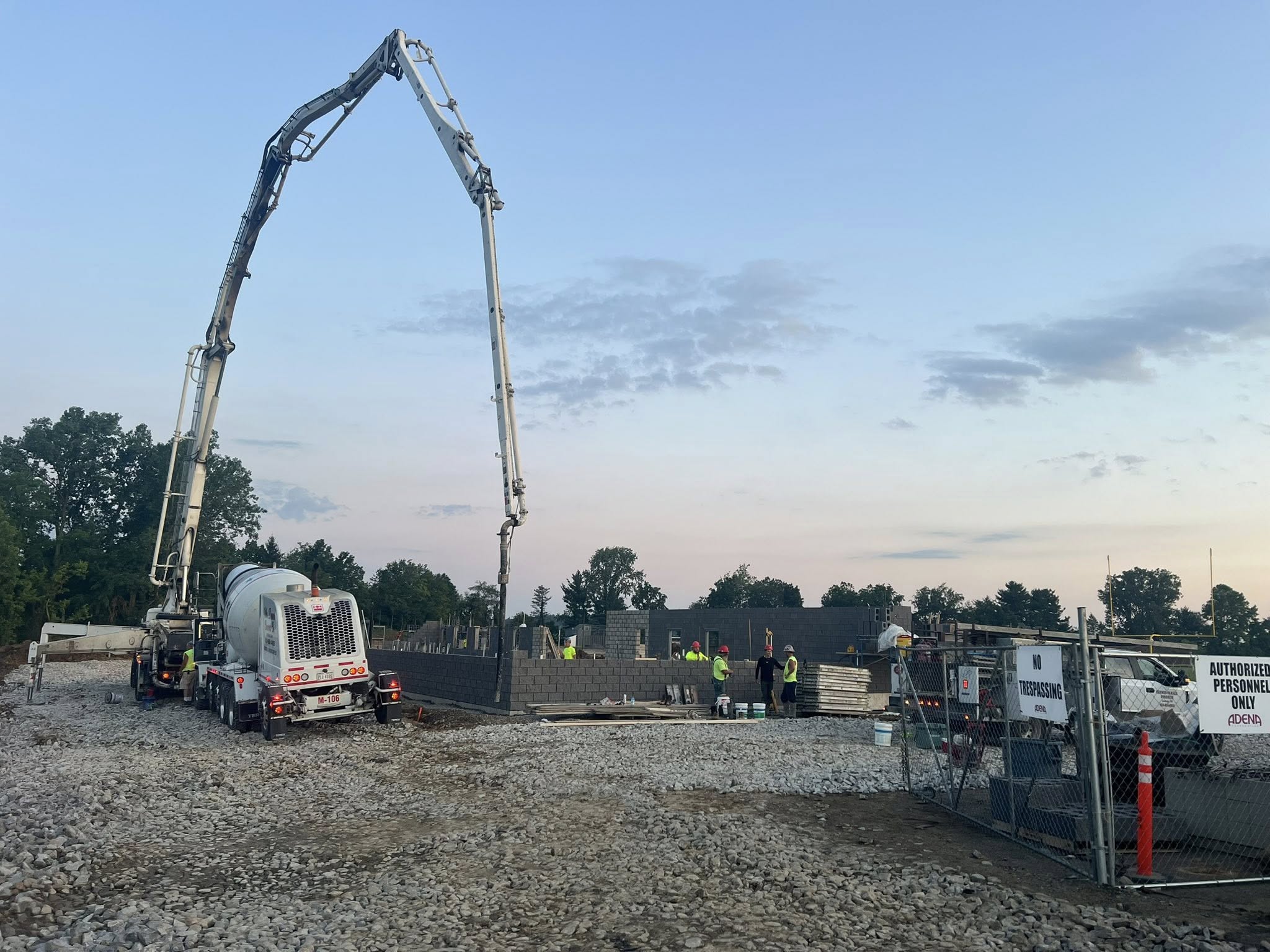 The pump truck at work, pouring concrete for a new building at the South Central Trojans high school.