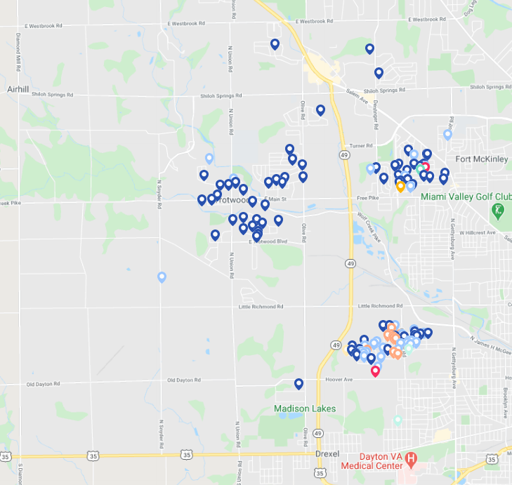 A map showcasing the properties marked for the Trotwood Housing Rehabilitation Program.